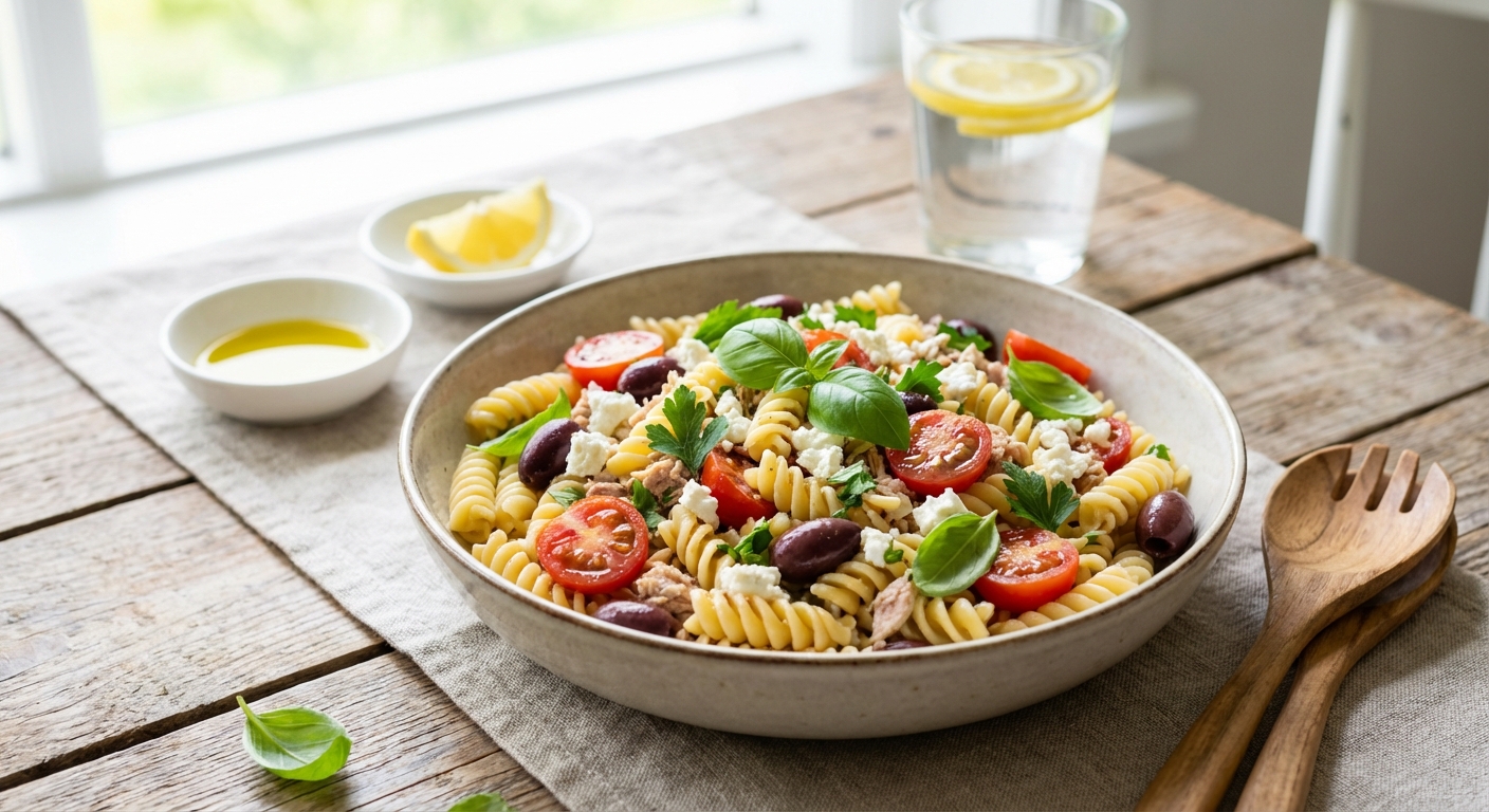 Helppo ja raikas tonnikala-pastasalaatti fetalla ja oliiveilla. Täydellinen kesäpöytään tai lounaaksi.