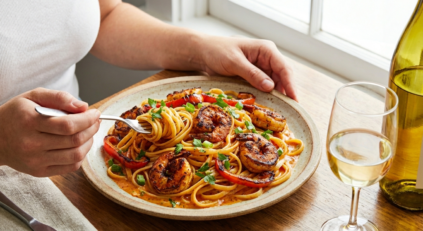 Mausteinen cajun-katkarapupasta yhdistää kermaisen kastikkeen ja merenelävät täydelliseksi arjen luksusateriaksi.