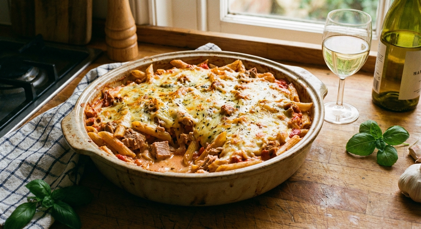 Helppo uunipasta tonnikalalla valmistuu yhden vuoan taktiikalla. Sopii kiireiseen arkeen!